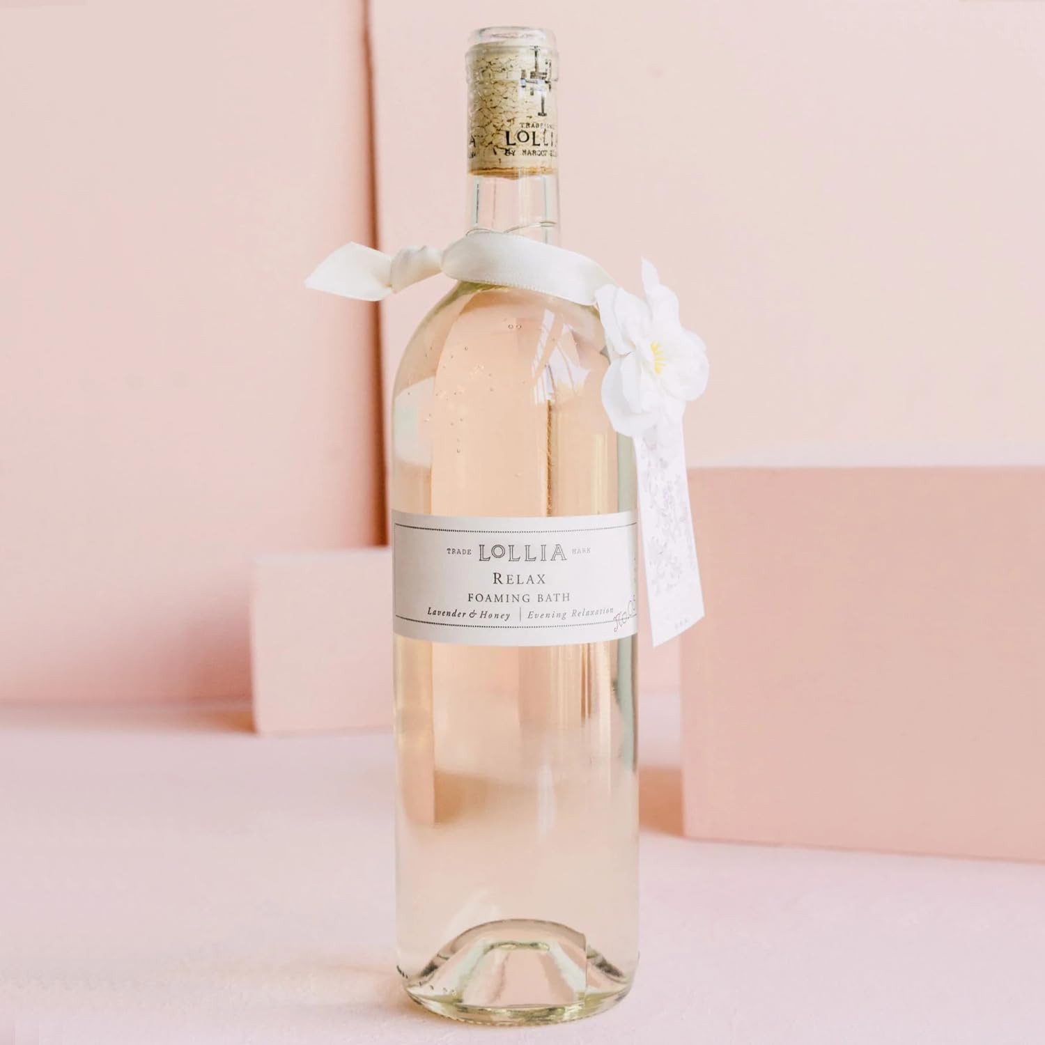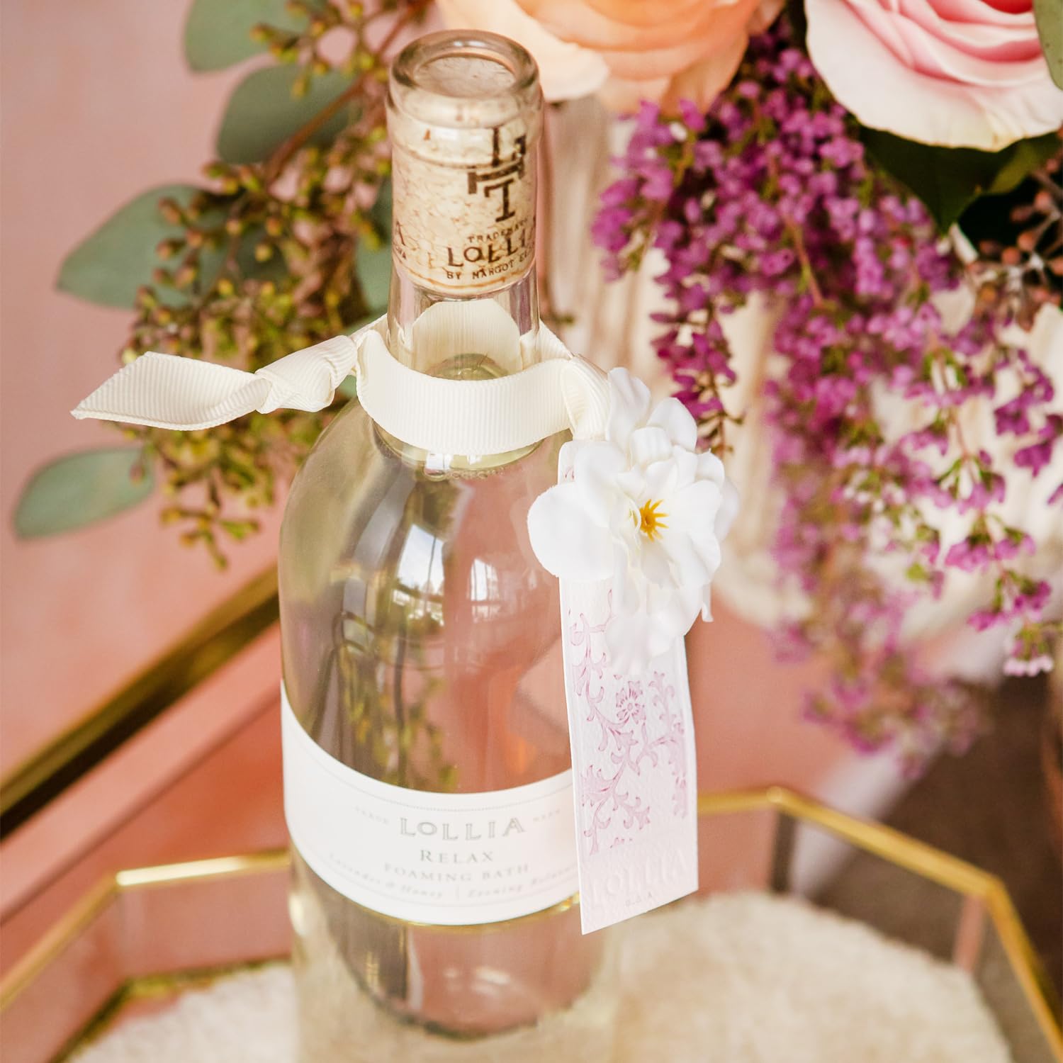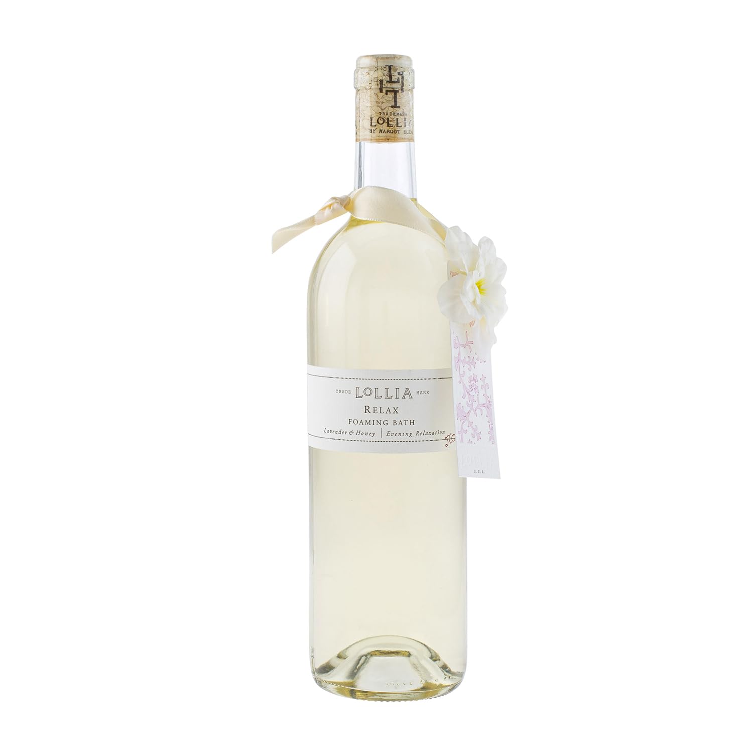 - A STRIKING GLASS BOTTLE: This classic wine bottle silhouette is elegantly finished with a white flower corsage, satin sash, and a signature Lollia cork. Featured in Oprah’s Favorite Things.