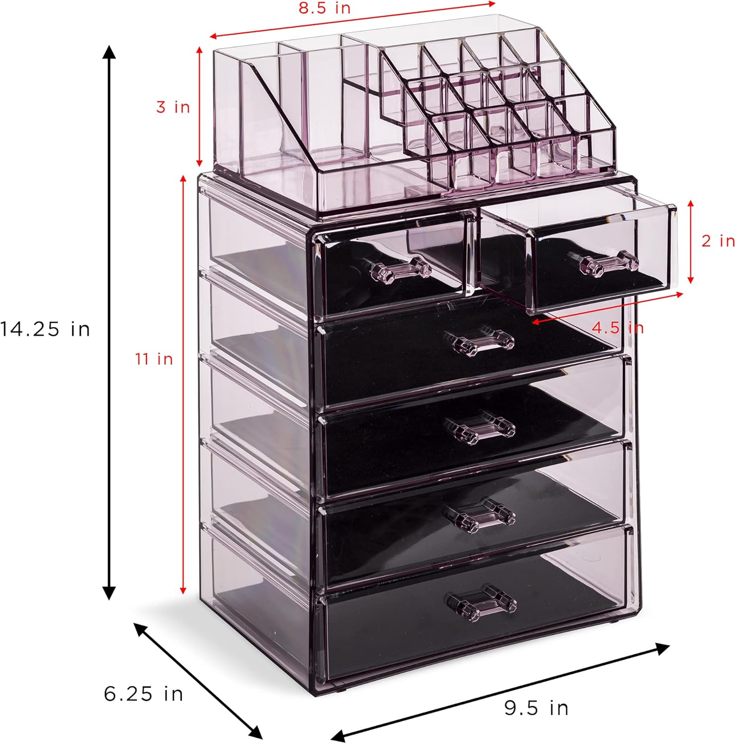 - Durable & long-lasting - Made of durable acrylic-like clear plastic - Includes 4 large drawers, 2 small drawers and 16 slot compartments - Drawers slide open smoothly with easy grip handles - Can also be used to complement other organizers by Sorbus - Measures approximately 9.25β L x 6.25β W x 14.25β H (drawers 1.87β deep)