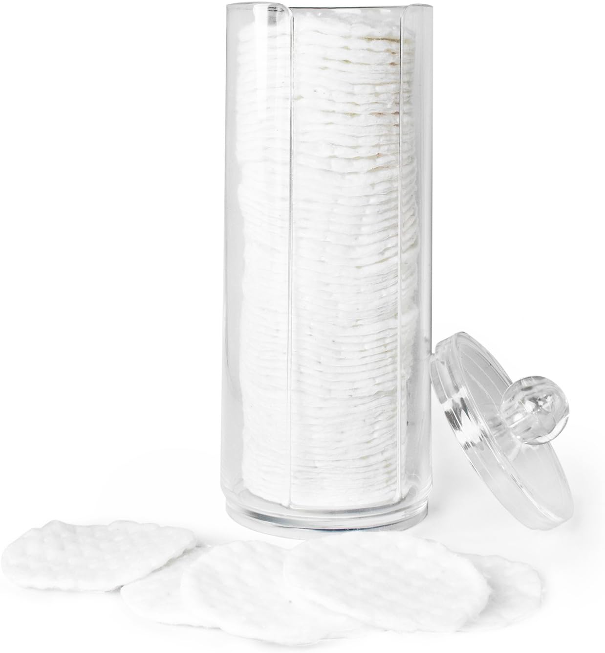 - Simple and sleek stylish clear design matches any decor and provides a fashion forward trend for your daily morning beauty routine. A simple tube-shaped design provides the organization space you need to store all your cotton pads!
