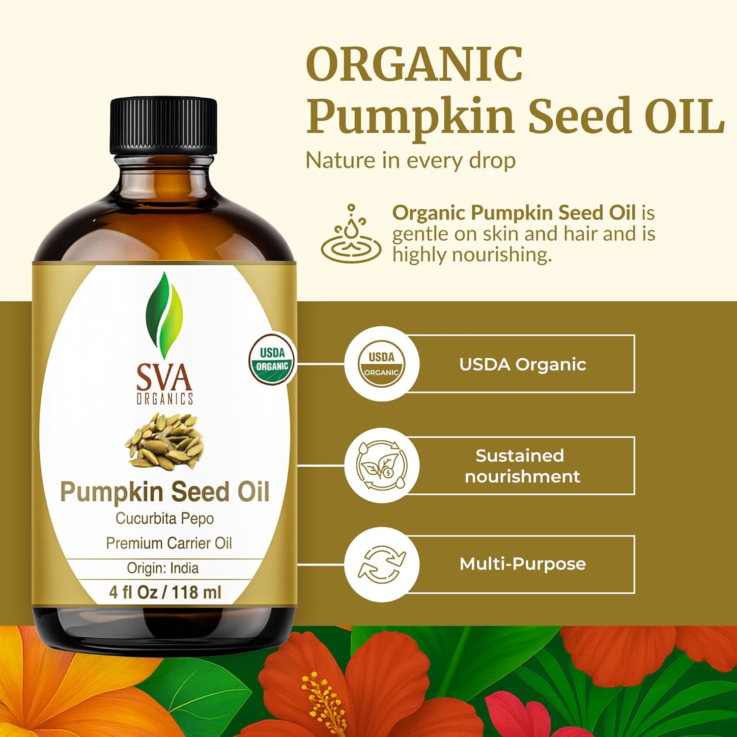 - Premium Quality Organic Pumpkin Seed Carrier Oil: SVA Organics Pumpkin Seed Oil 4oz is obtained by cold-pressed extraction of Cucurbita Pepo seeds. Our Pumpkin Seed oil Organic is free of preservatives and comes with a dropper for easy application. It is not tested on Animals. We care for you!