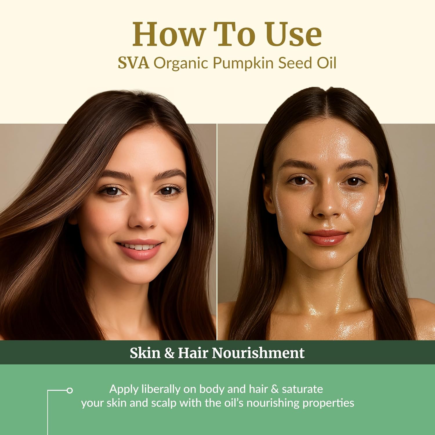 - How To Use: SVA Pumpkin Seed Oil Organic cold pressed is easy to use. Pour a few drops on your palm and gently massage your scalp and skin with it for a few minutes. Leave it for some time and wash it off with a mild cleanser. You may use Pumpkin Seed oil cold-pressed for hair or skin and leave the oil overnight for better results.