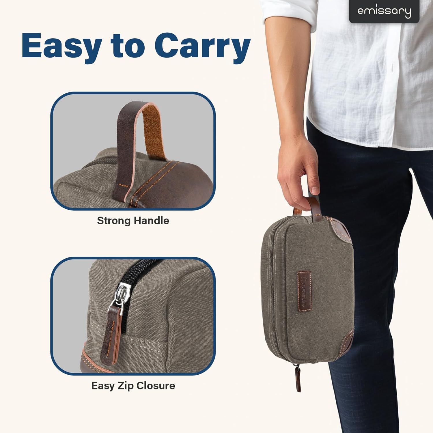 - HIGH-QUALITY DURABLE MATERIAL: This exceptional toiletry travel bag by emissary is made of canvas and PU leather, which is known for its lightweight yet durable qualities, the perfect combination for traveling. This specific material is water resistant, making it safe for use in environments where it may become wet. Making this the perfect bathroom bag, shaving bag, and travel dopp kit.