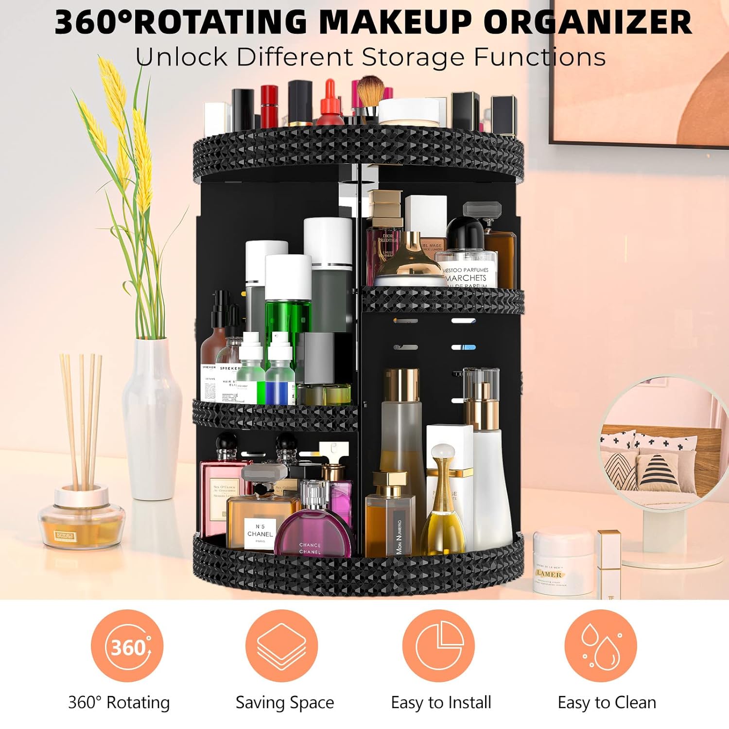 - đăCONVENIENT DESIGNăHemtroy rotating makeup organizer has a noiseless and 360° rotating base to help you easily find cosmetics in seconds. Make your appointments less late and your desk less cluttered.