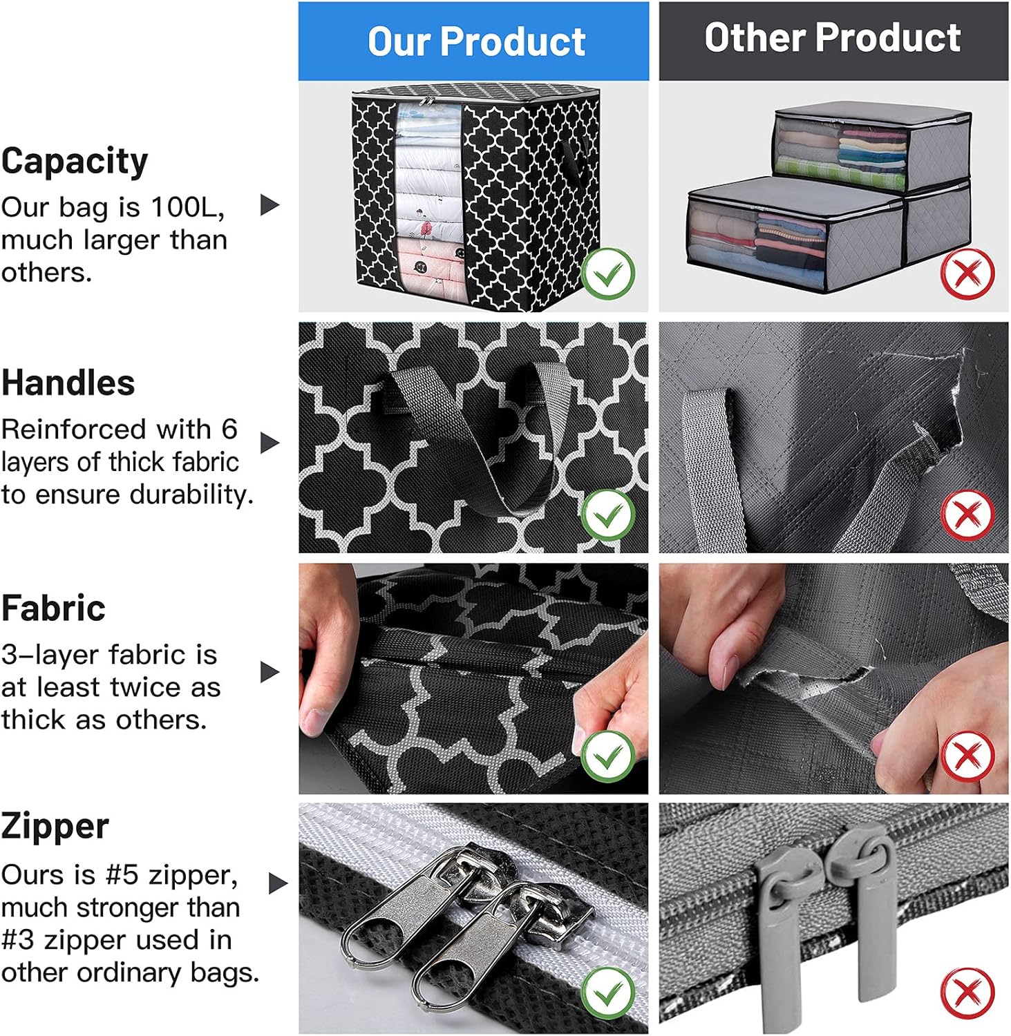 WISELIFE Storage Bags [3 Pack/100L] Large Blanket Clothes Organization and Storage Containers for Comforters,Bedding, Foldable Organizer with Reinforced Handle, Clear Window, Sturdy Zippers,Black