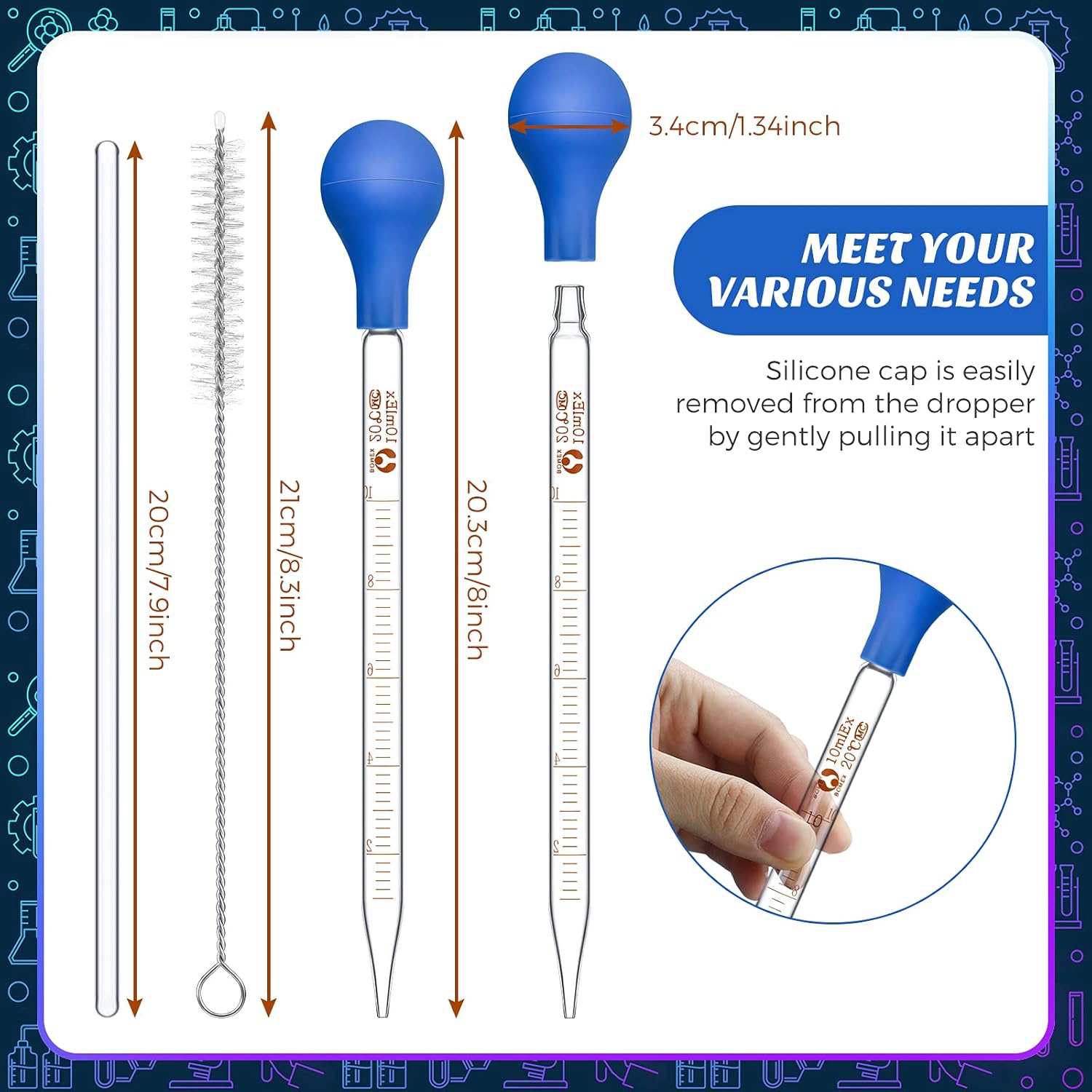 - Size information: dropper is 7.9 inch, glass stir rod measures 20 cm and 20 cm washing brush, apply for testing laboratories, chemistry, microbiology, liquids, scents and more