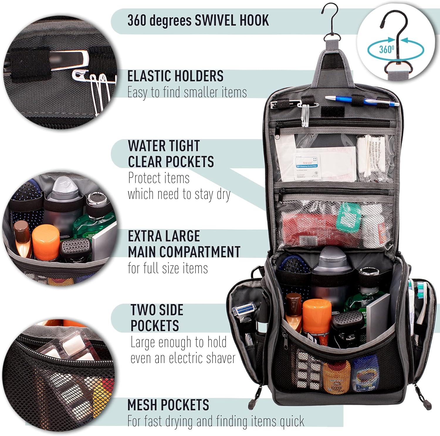 - KEEP ESSENTIALS WITHIN REACH - The metal hanging hook lets you hang the travel toiletry bag on everything from towel bars to tree branches. If none of those are around, you can also clip the bag to your belt using the included field straps with carabiners.