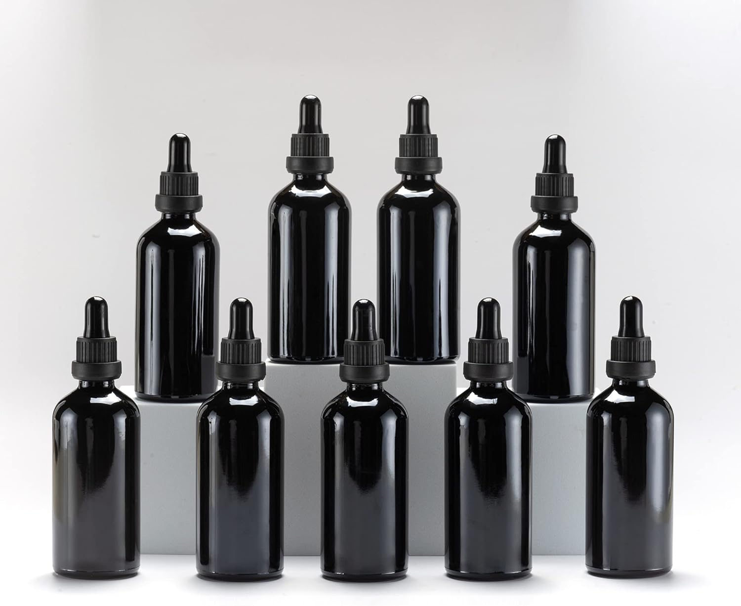 - [Glass Bottle with Dropper 4oz] Eye Dropper Bottles glass is black, it designs to protect the essential oil against UV rays. Made from high quality glass.BPA FREE.Refillable, washable and travel friendly. leak proof