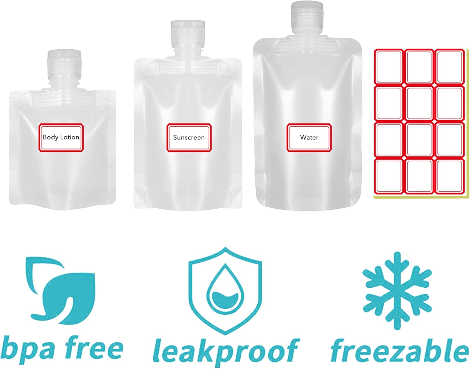 - PRACTICAL DESIGN --- These fluid makeup packing bags are lightweight and easy to carry, the flip cap design makes it easy to open and close, the stand up bottom allows an easy storage, the compact size allows it to be placed in a cosmetic bag and suitcase