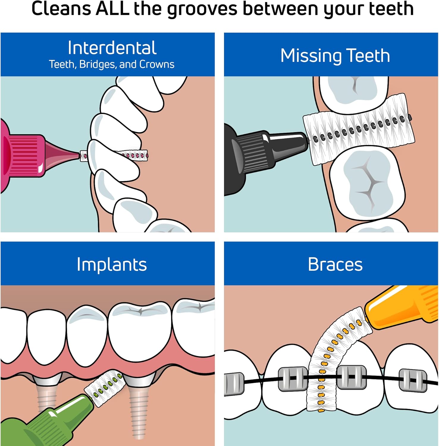 - INTERDENTAL BRUSH: Our Original interproximal brush is designed to clean gaps between your teeth that a normal toothbrush can’t reach. Choose our multipack of different sizes or one of our same-sized brush packs to fit your teeth.
