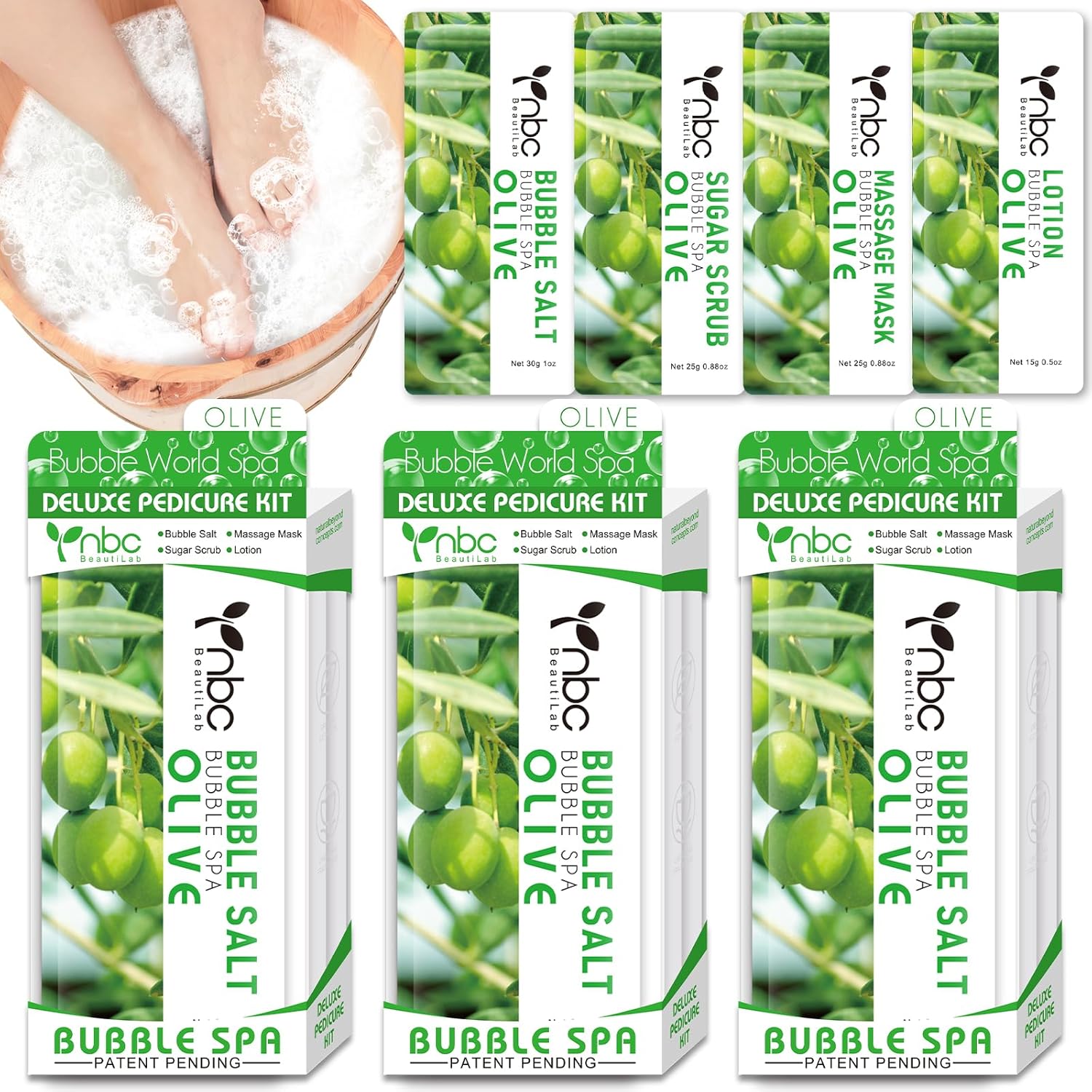 Pedicure Kit Foot Soak Set: Bubble Salt, Sugar Scrub, Massage Mask, Massage Lotion in a Box, 4 Step Foot Spa Kit for Dry Feet, Calluses and Tired Feet(3 Set Olive)