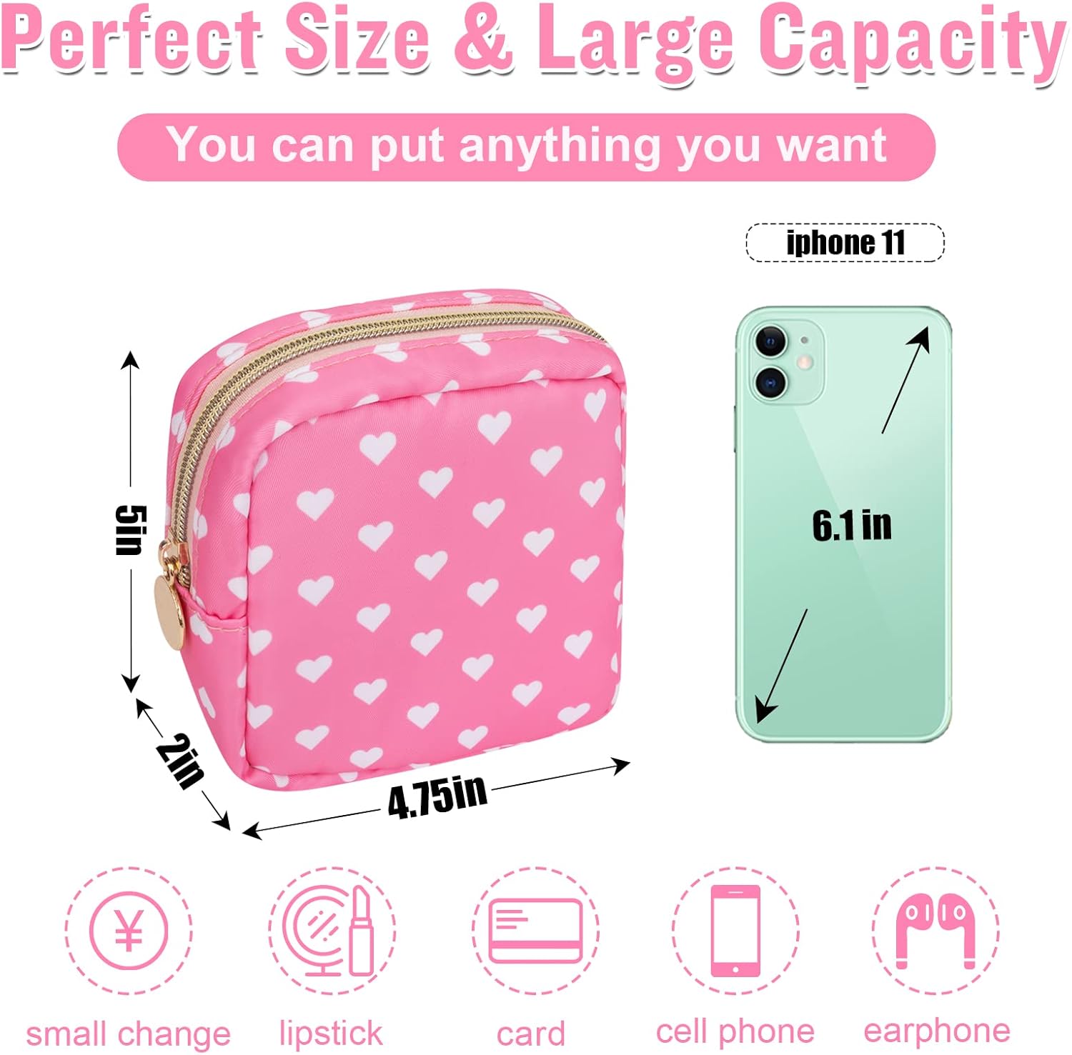 - ❤【Compact & Perfect Size】Mini Makeup Bag Size is 5*4.75*2inch/12.7*12*5cm, the compact storage bag can store all your sanitary napkins, lip balms, lipsticks, cosmetics, mini mirrors, jewelry, keys, cash, credit cards, etc. The easy and large opening design makes it easy to take. Keep your contents separate and organized.
