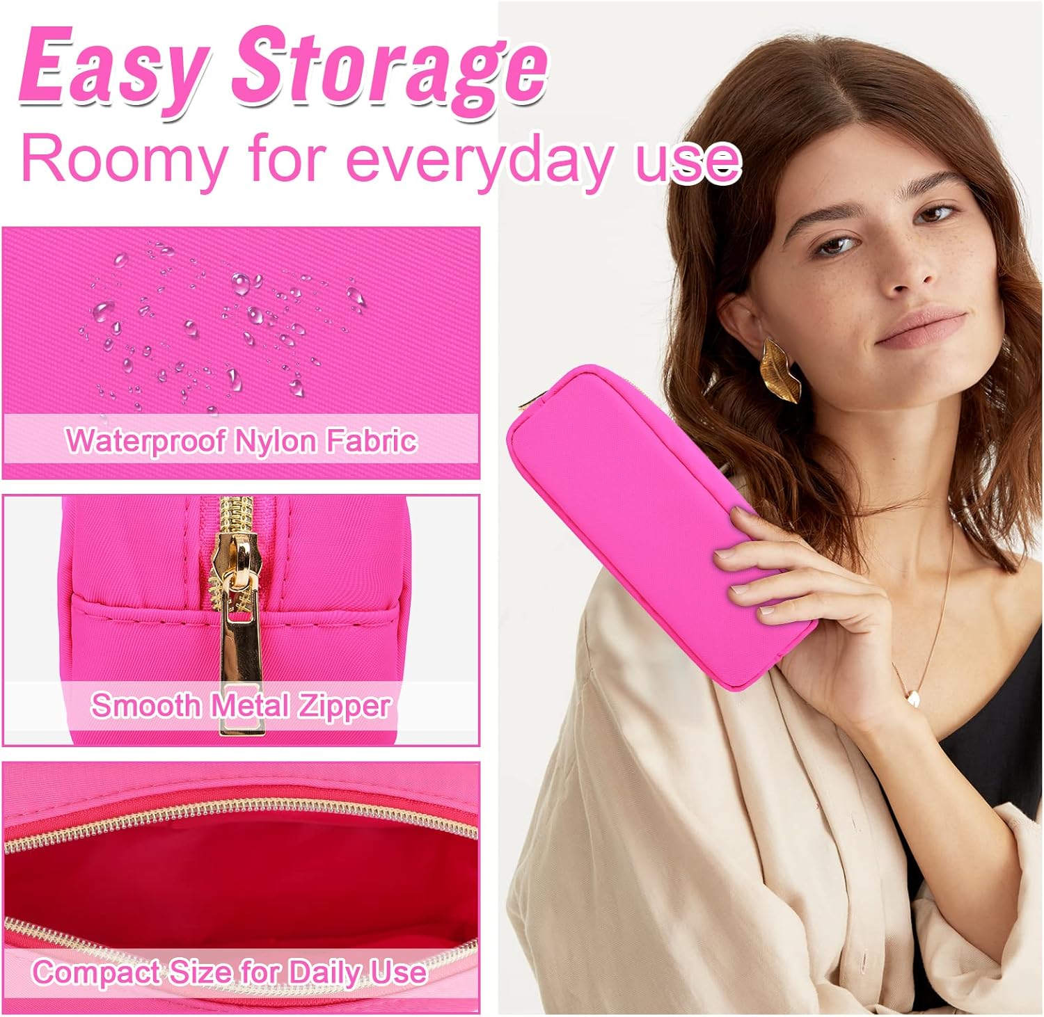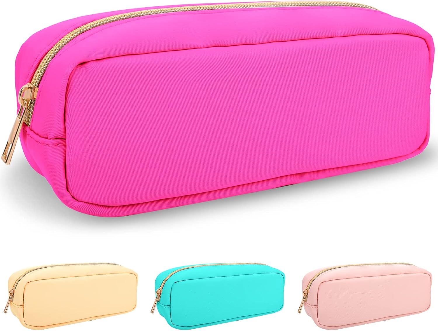 Izuzt Nylon Small Makeup Bag, Slim Pouch - Preppy Cute Makeup Brush Case, Cosmetic Zipper Pouch for Purse, Waterproof Travel Toiletry Bag Clutch, Makeup Organizer for Women & Girls (Hot Pink)