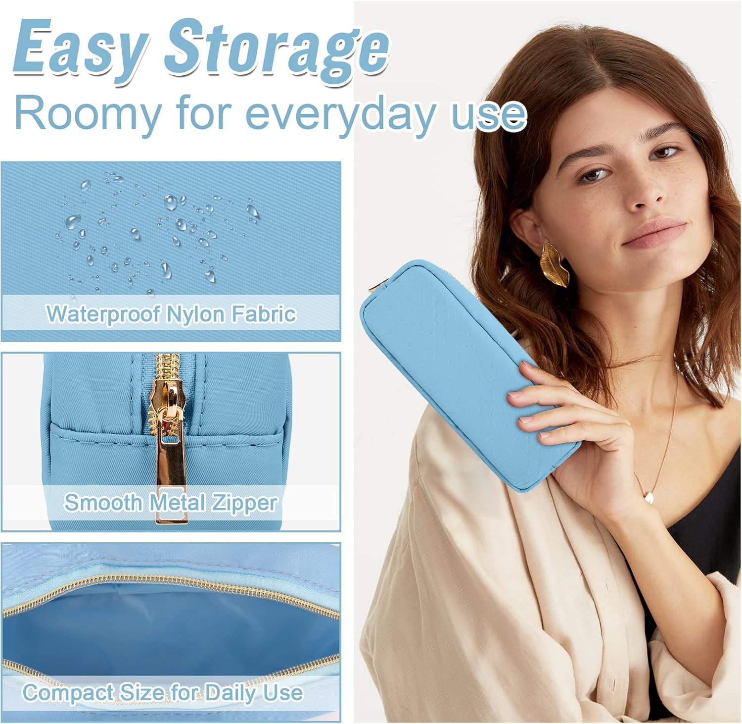 Izuzta Nylon Small Makeup Bag Slim Pouch, Preppy Cute Brush Case, Cosmetic Zipper for Purse, Waterproof Travel Toiletry Clutch Coin Organizer for Women Girls (Blue)