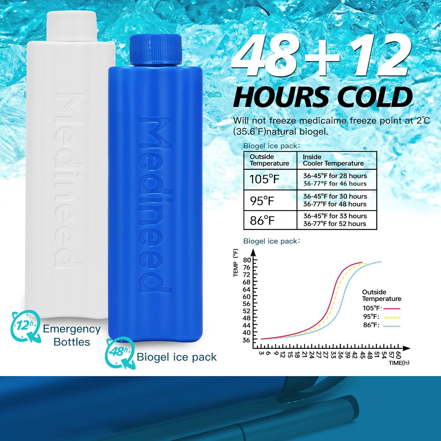 - 2 COOLING METHODS: 1) The blue ice pack with biogel provides 48 hours of cooling time; 2) The white ice water bottle adds an additional 12 hours of cooling time when filled with ice water; So you can travel without worrying about your medication expiring