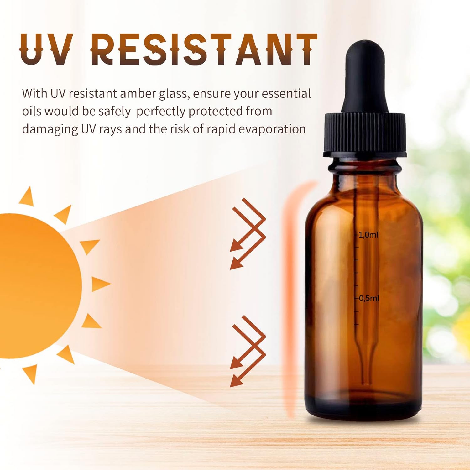 - 【UV RESISTANT】The amber dropper bottle is made of UV resistant amber glass, BPA and lead free, blocks light and prevents the oxidation of essential oils, ensuring your essential oils and perfumes are safe and perfectly protected from harmful UV rays and the risk of rapid evaporation.