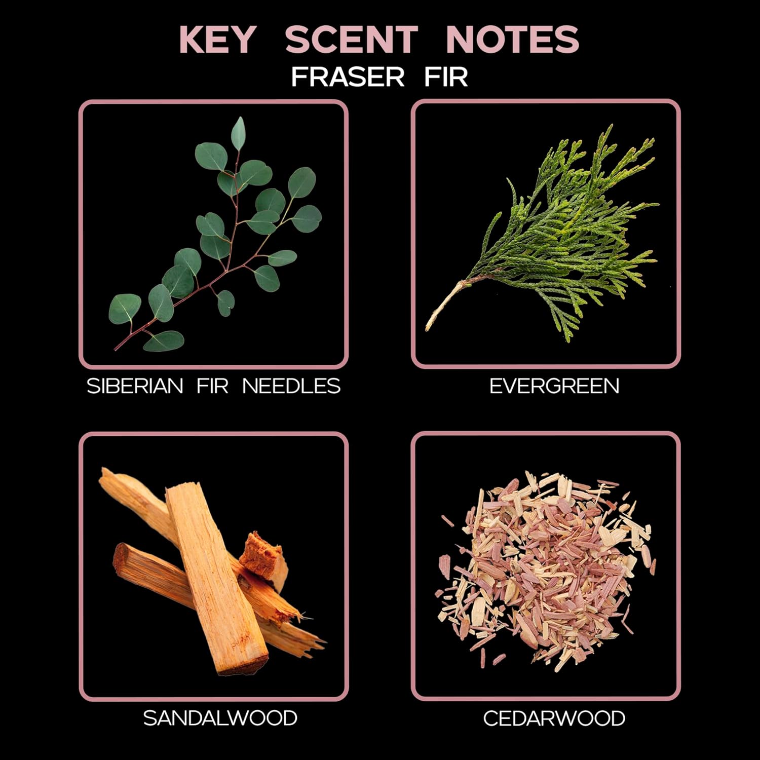 - FRASER FIR – captures the nostalgic essence of Fir, Evergreen, Pine, Cedar, and Sandalwood; presented in our Modern Striped Diffuser, a sleek frosted glass bottle etched with clean vertical stripes for a minimalist yet eye-catching look, topped with a slender neck and delicate forest green ribbon accent for a refined, timeless look, and filled with real juniper branches with berries; perfect for pine, deep green, and rustic holiday décor