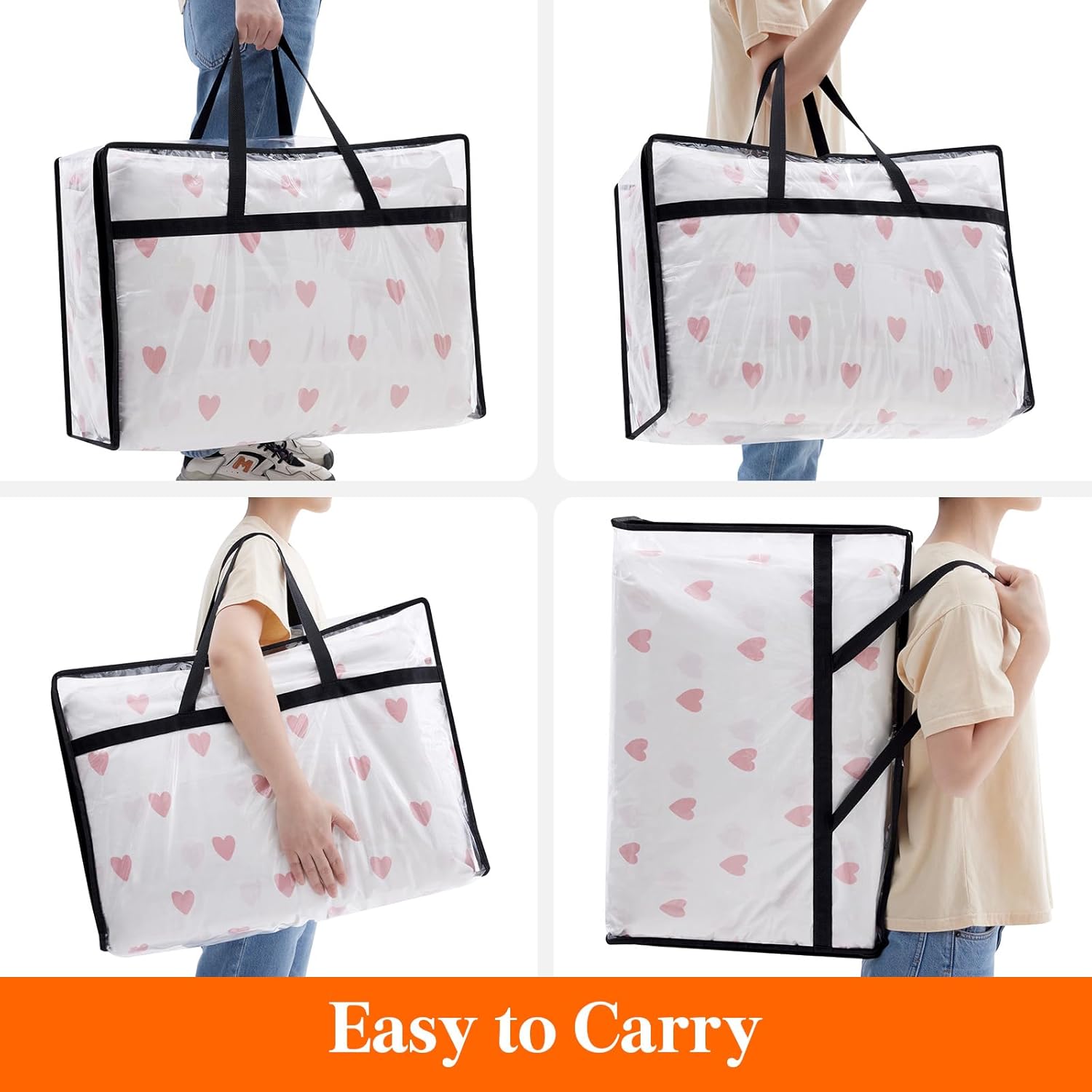 - Easy to Use: The storage bins with lids feature reinforced carry polyester webbing handles for enhanced durability. With their ample length, these handles allow for easy one-handed carrying or convenient shoulder transportation. The transparent color of the comforter storage bag enables effortless visibility, allowing you to quickly locate and access your belongings.
