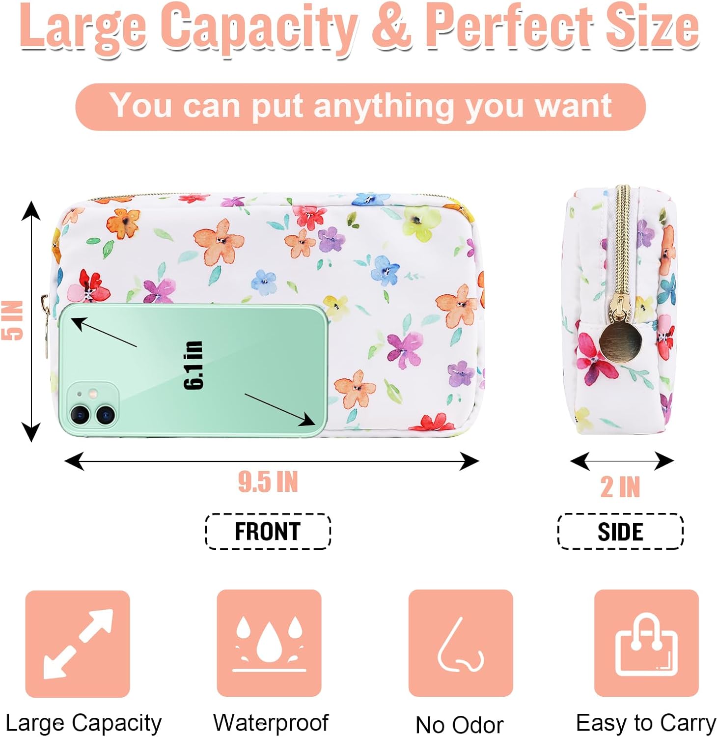 - ❤【Large Capacity & Perfect Size】Small Flower Cosmetic Bag Size is 9.5*5*2inch/24*12.7*5cm, the large capacity storage bag can store all your cosmetics, snacks, phone, purse, sunglasses, travel essentials and anything you need. The easy and large opening design makes it easy to take. Keep your contents separate and organized.