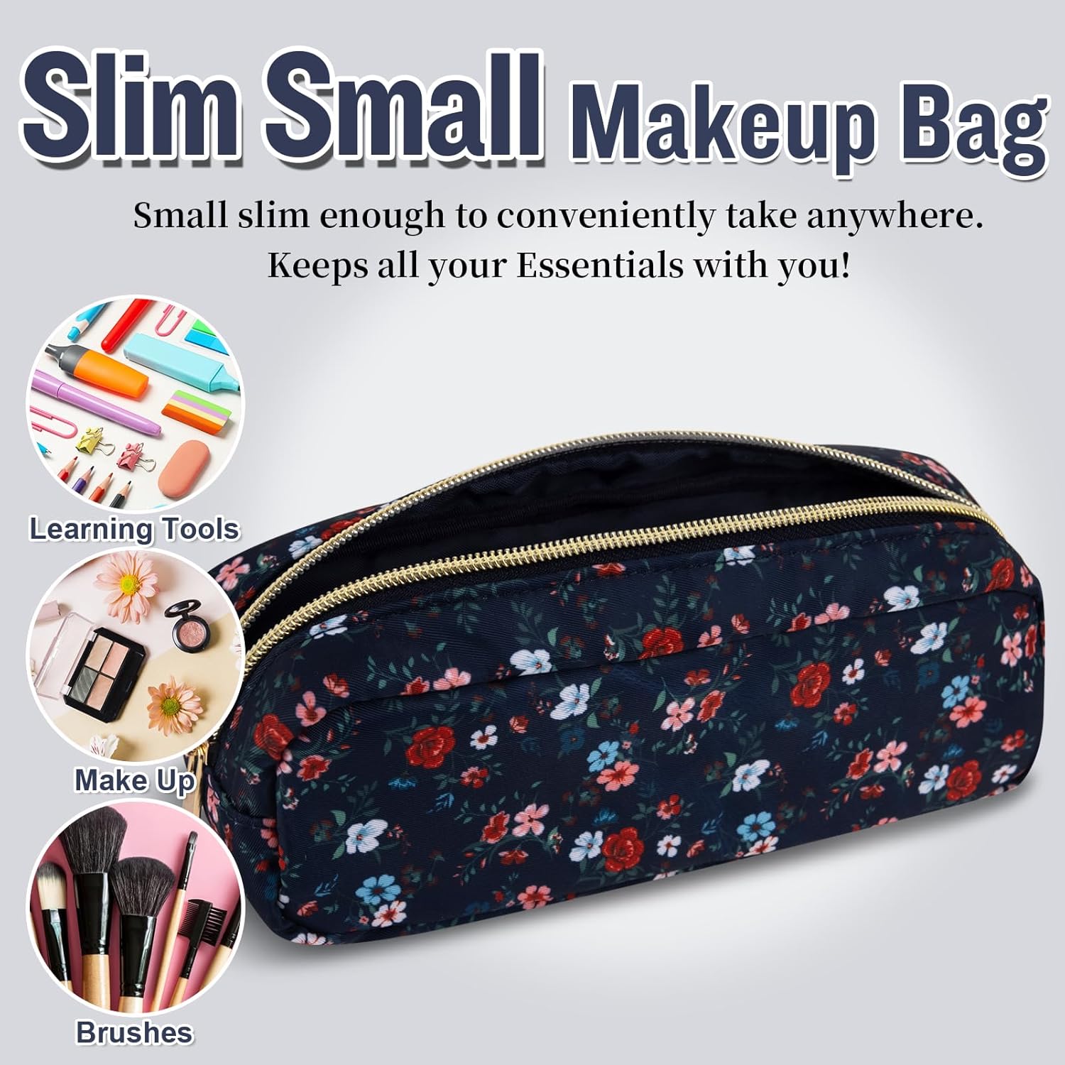 - ❤【Premium Materials】Slim Small floral makeup bag is made of high-quality nylon waterproof material and durable gold zipper, which does not fade, has no peculiar smell, and is durable. Stylish appearance, easy to wipe clean, dustproof and waterproof. The makeup pouch interior is covered with thick sponge to protect your belongings at all times.