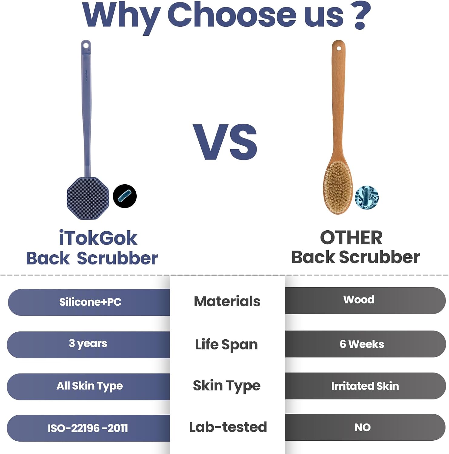 - ISO-22196 -2011 Test : iTokGok Long Handle Silicone Back Scrubber Infused "Micro-KF113 silver" ,Tests Displayed An Efficacy Rate Exceeding 99.9%.