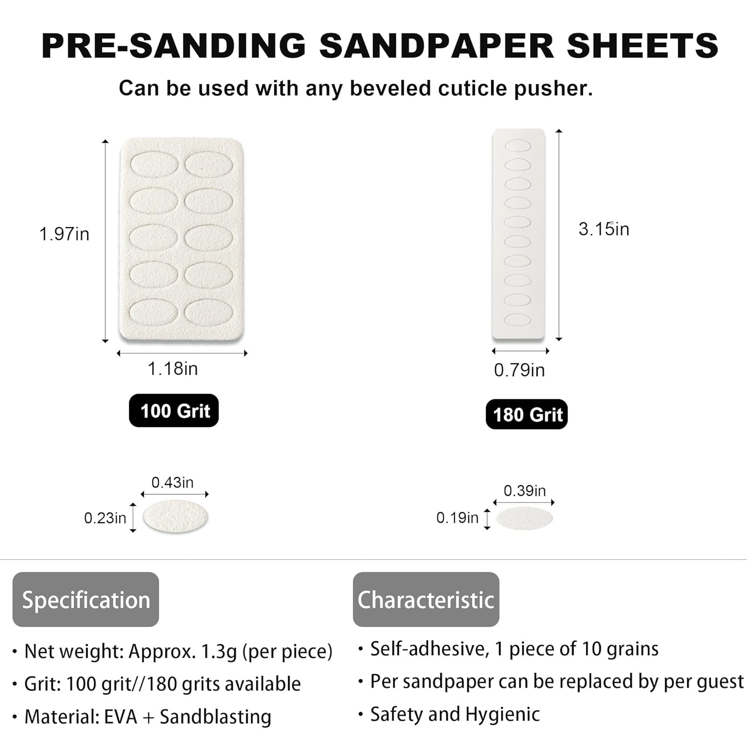 - Efficient Cuticle Care - You will get 1pc double head horseshoe cuticle pusher/slant nail pusher and 1pc(10 grains) 100 grit rougher sandpaper, 1pc(10 grains) 180 grit fine sandpaper. It's safe and effective to clean up nail dirt, remove dead skin, file natural nails and so on, without damaging the nail surface and leaving no dead space.
