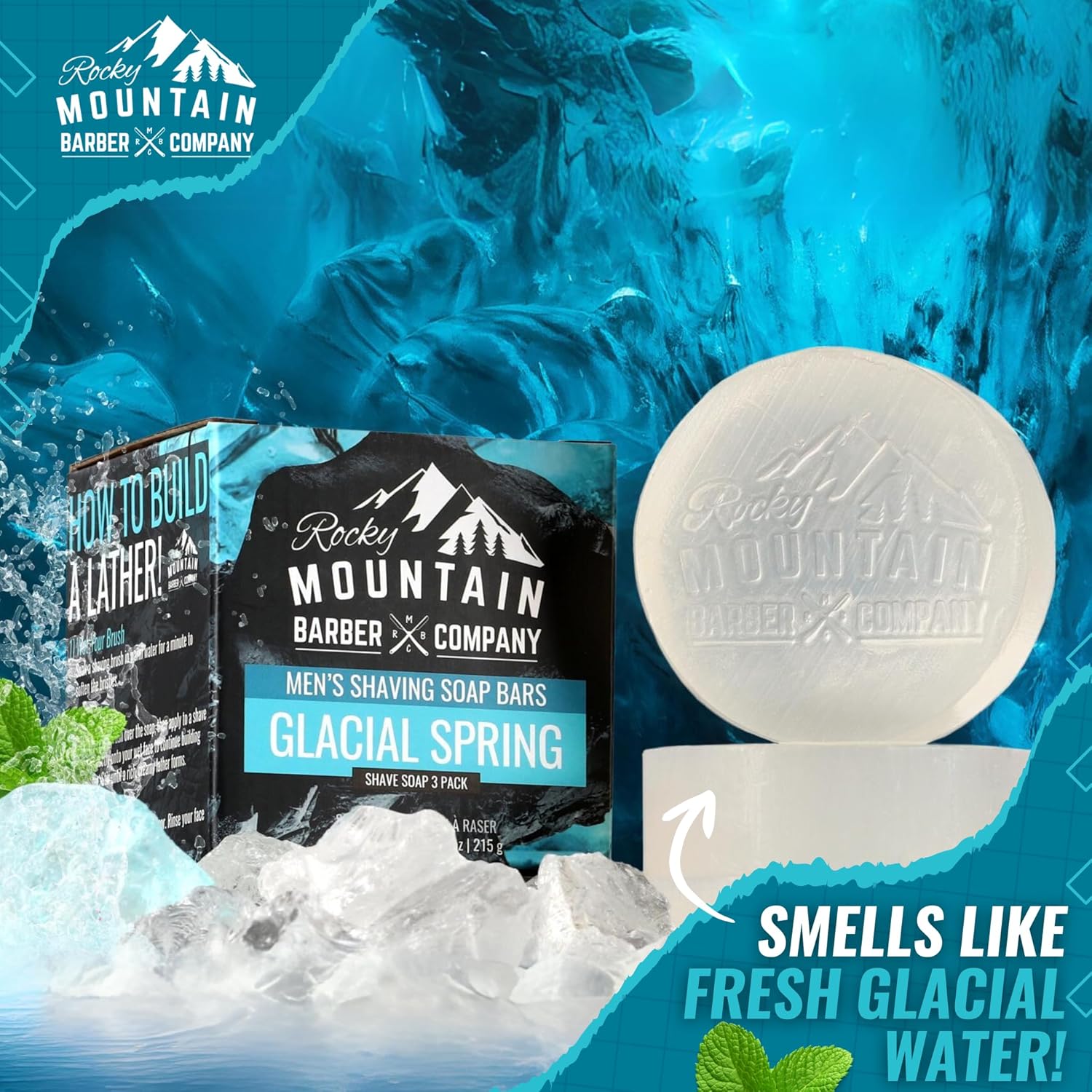 Shaving Soap Pucks for Men - 3 Pack - Traditional Wet Shave Glycerin-Based Shave Soap Bars - Made in USA For Use with Shaving Brush and Bowl - Glacial Spring Scent by Rocky Mountain Barber Company
