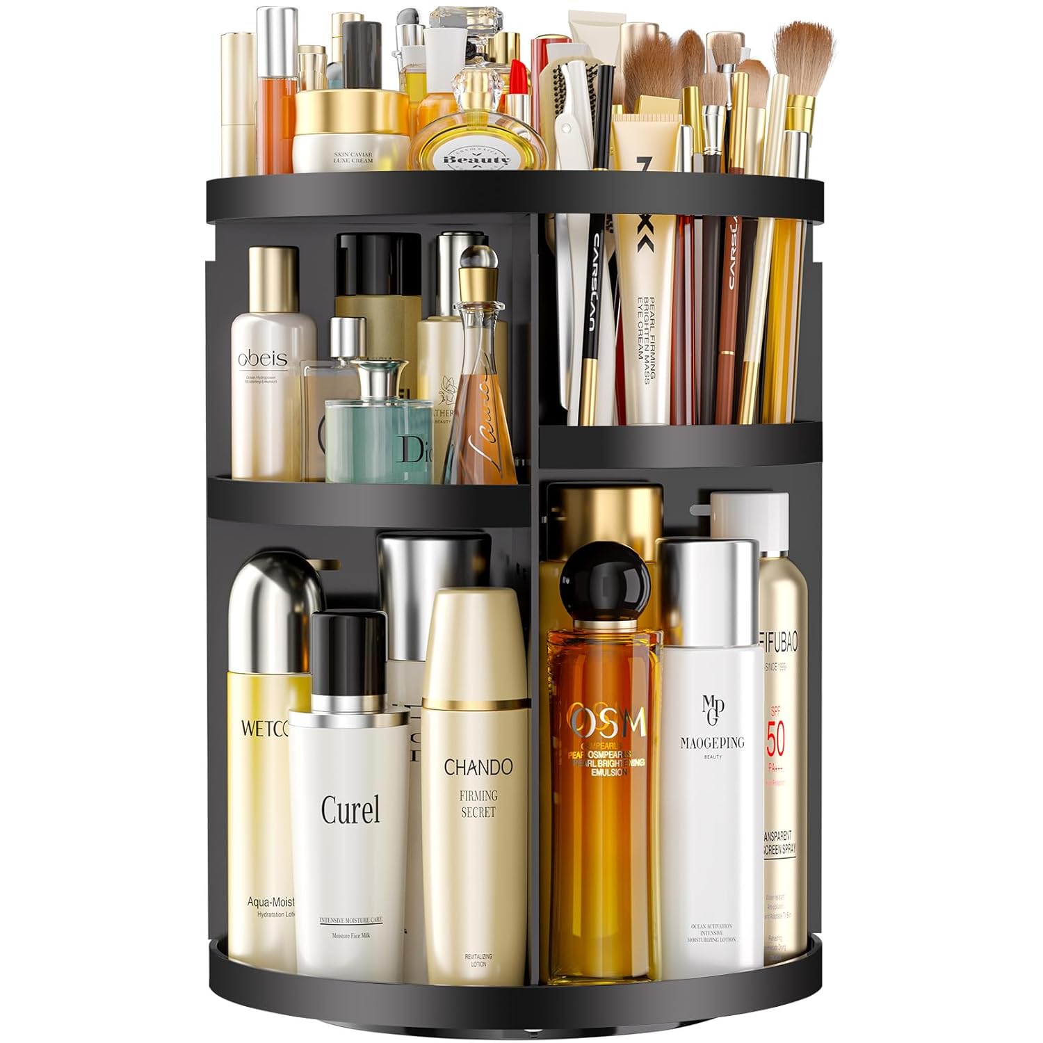 - 【7 ADJUSTABLE LAYERS & SAVE SPACE】✨360 rotating makeup organizer has four trays that you can adjust to easily store all your things. Ourmake up organizers can store at least 18 perfumes, 14 facial toners, 12 facial moisturizers, 8 makeup brushes, 6 powders, 5 makeup remover, etc. Save 70% of your desktop space.
