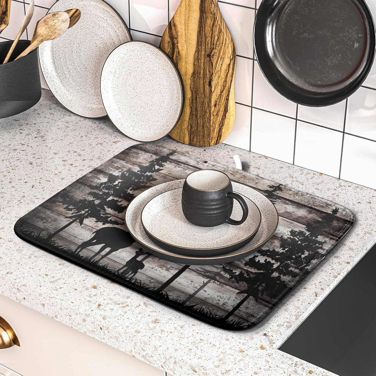 - 【Wide Usage】The dish drying mat designed with woodland hunting pattern, it is beautiful, soft, and durable. Not only a dish drying mat, cup mat, heat resistant mat, you can also use it as a kitchen countertop insulation mat. It is also a good choice to use it as a pet mat, picnic mat.