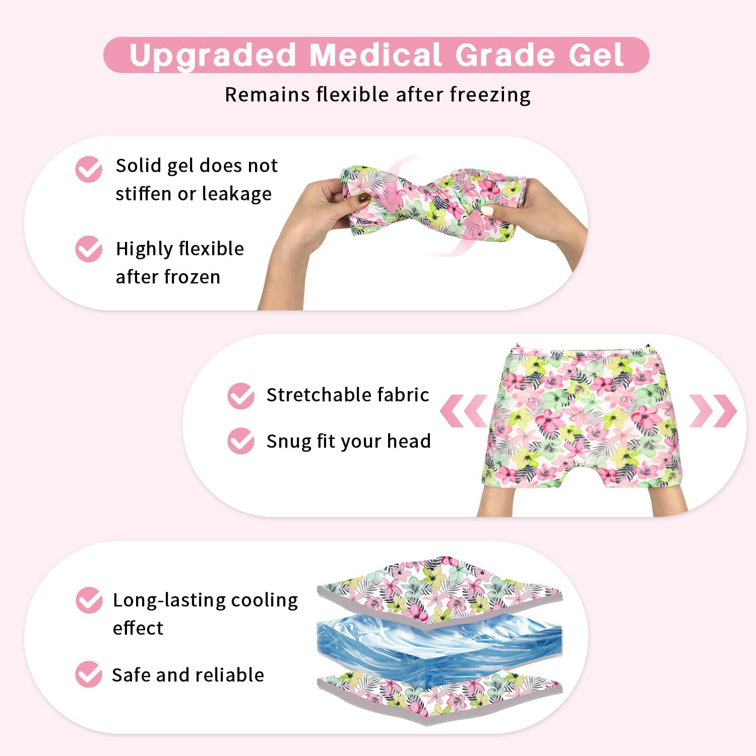 - 【360° Full coverage Headache Relief Cap】The Migraine Relief Cap is made from a 360-degree solid gel, and the upgraded Ice Migraine Relief Cap has 20% more coverage in the cranial top area than other migraine caps, which will provide complete coverage for your head. It is malleable, do not have to worry about falling off or not wearing in the case, the product uses a "v" shape design at the nose, when used, you can pull it to the nose, you can achieve the effect of shading.