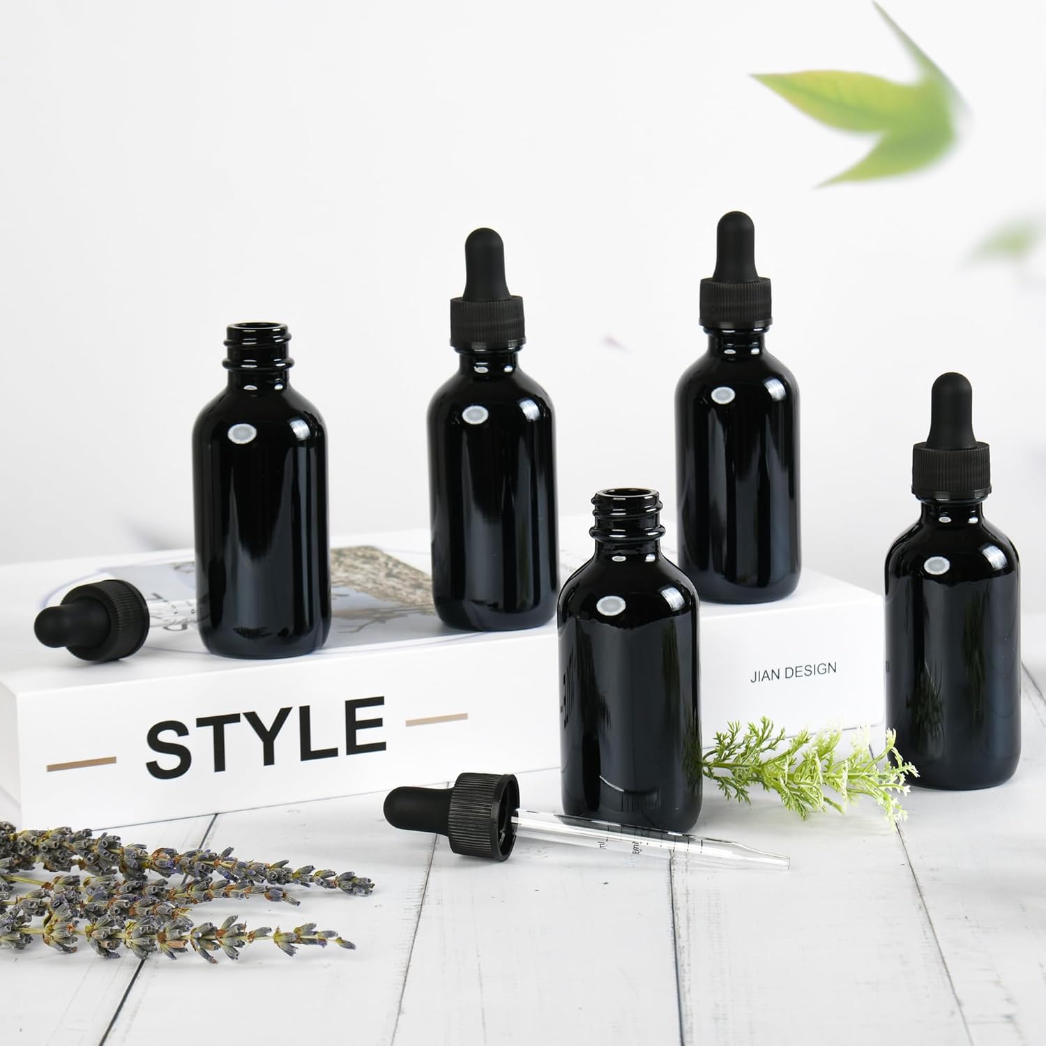 BILLIONSTARS 24 Pack 2oz Glass Boston Round Bottle with Graduated Calibrated Glass Pipettes - UV Black - Tincture Bottles for Essential Oils, Liquids - Leakproof Travel Bottles