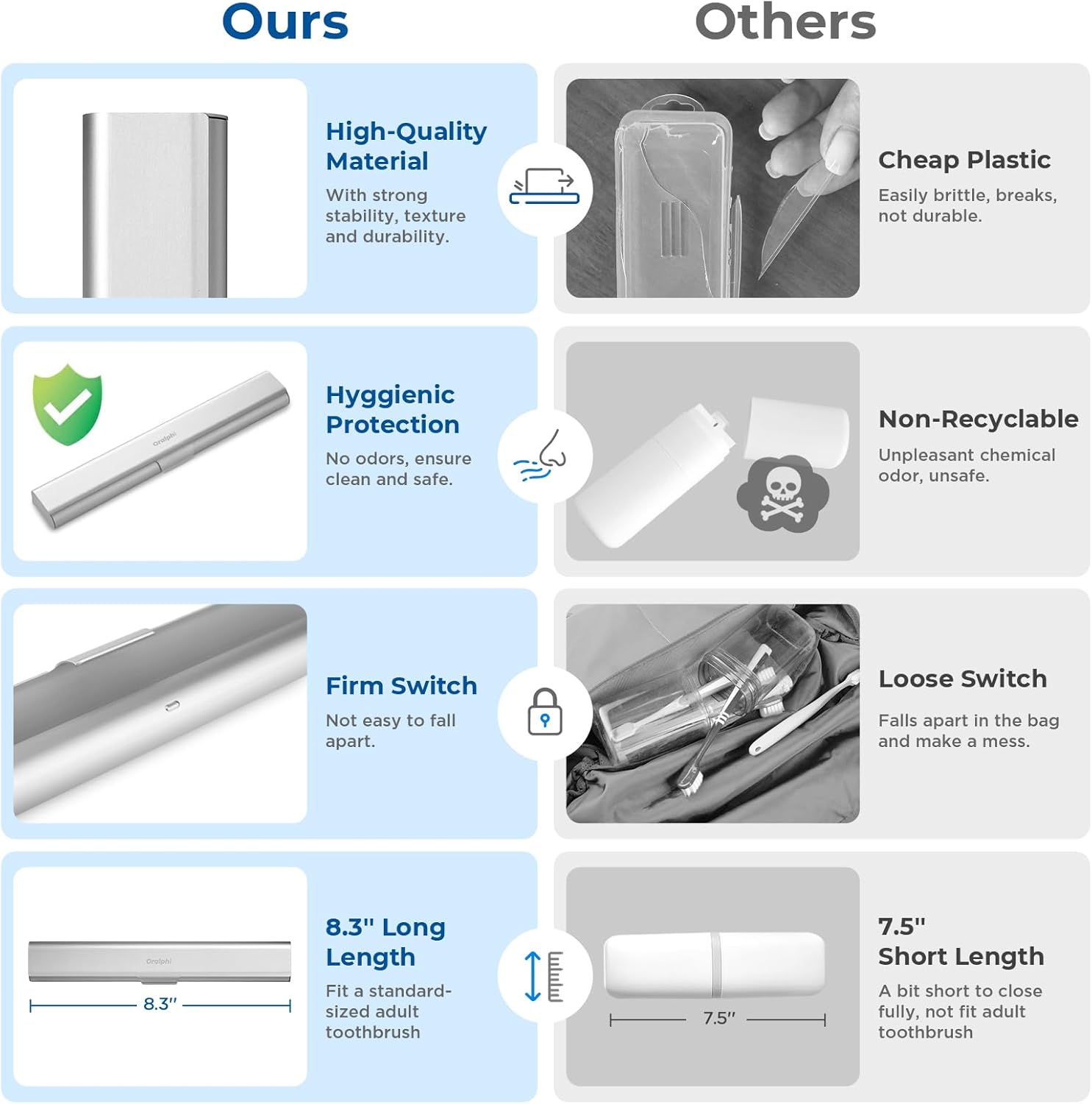 - High-Quality Material: Made of food-grade durable aluminum alloy, our travel toothbrush case is safe, non-toxic, odorless, and rust-free. Say goodbye to the common problem of the brittleness of plastic, as our toothbrush container stands the test of time with its robust build. Ensures your toothbrush stays clean and safe