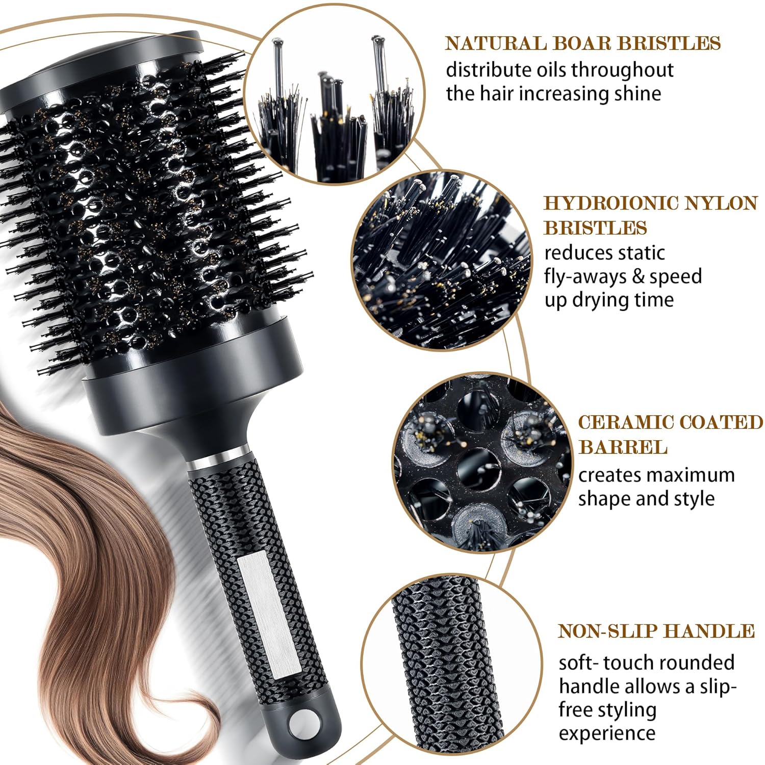 - Nano Ceramic Ionic Technology: Transform your styling routine with our round hair brush, engineered for superior shine and smoothness. Natural boar bristles distribute oils for lustrous hair, while ionic technology minimizes frizz and damage. The evenly-heating ceramic barrel reduces blow drying time, making your styling faster and healthier. Upgrade to salon-quality results at home