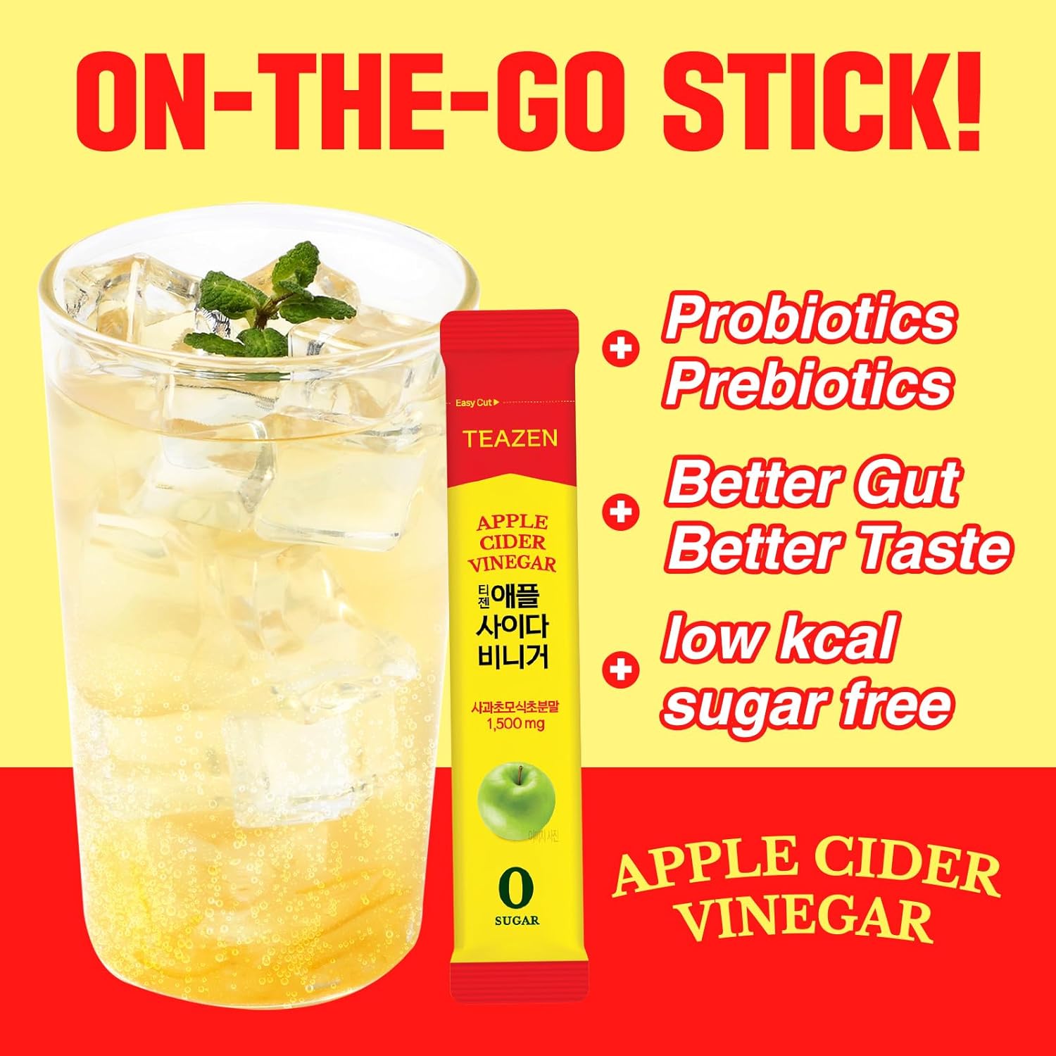 TEAZEN Apple Cider Vinegar Drink Powder Stick – On-the-Go Wellness with 1500mg ACV, Sugar-Free, Postbiotics, 10 Sticks | Supports Digestion & Metabolism