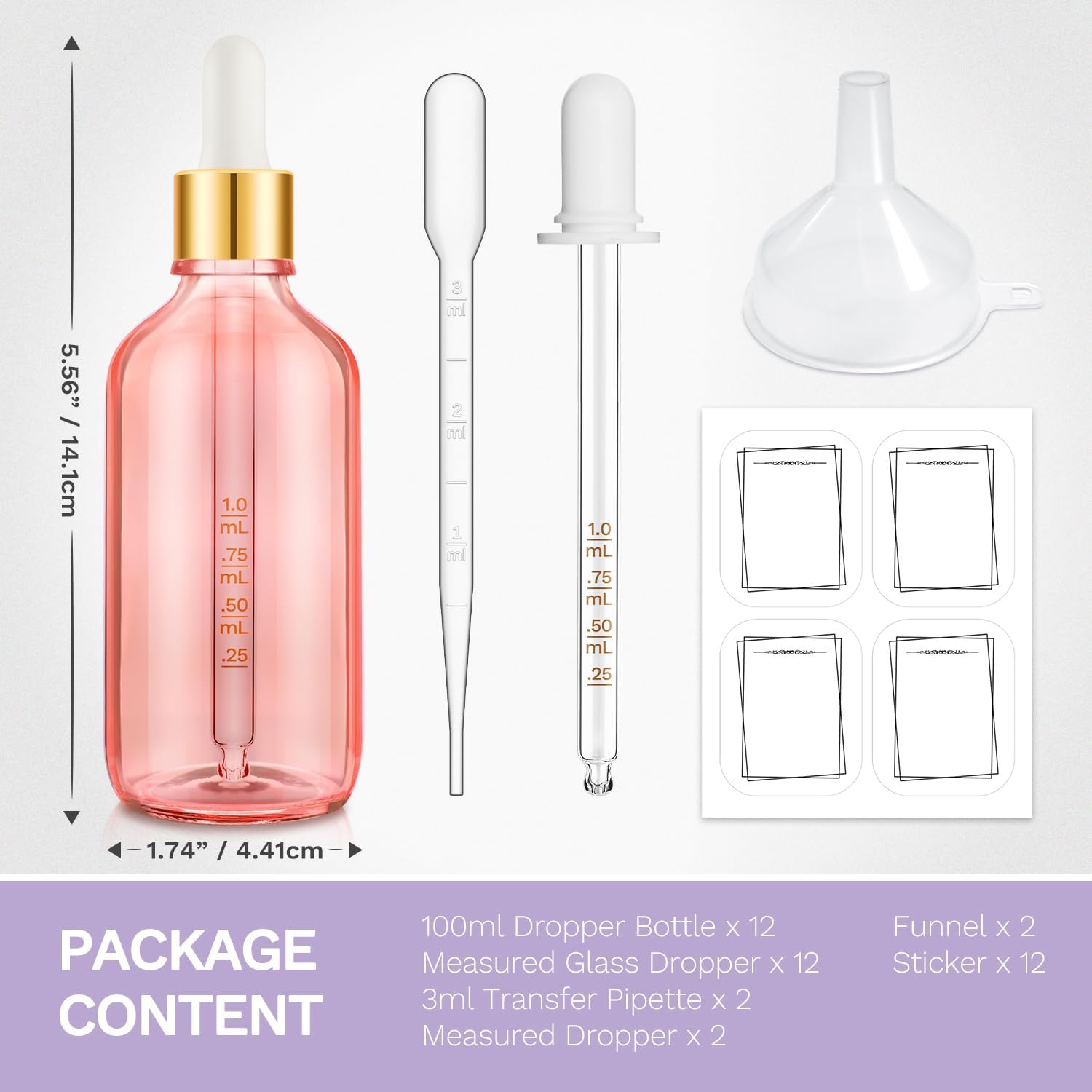 Bumobum 2 Pack, 100ml Pink Glass Dropper Bottle- 3.4 oz Glass Tincture Bottles with 1 Funnel & 1 Pipette & 4 Labels, Leakproof Eye Dropper for Oils, Liquids
