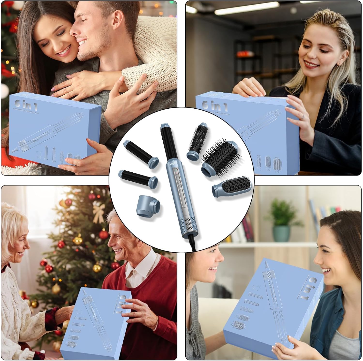 - 6 in 1 High Speed Blow Dryer Brush:Long press 2s Power button to turn on/off the hair dryer. 6 in 1 hair styler kit includes 1*high-speed ionic hair dryer, fast drying hair, 2*hair curlers to curl in different directions, curl set automatically Technology, 1*round brush smooths,and adds bounce, 1*Volumizer, reduces static and tangles, increases fluffiness,1*Massage hair straightener brush for straightening & smoothing. Explore styles for any hair type,saving your time and money.