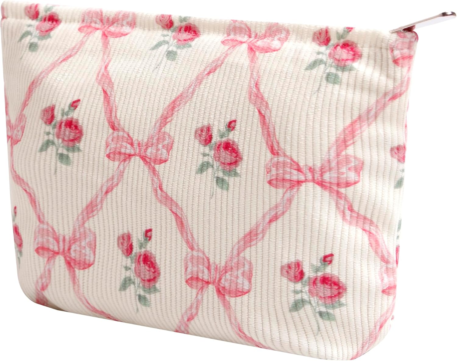 Cosmetic Bags for Women - Corduroy Cosmetic Bag Aesthetic Women Handbags Purses Smile Dots Makeup Organizer Storage Makeup Bag Girls Case Bags (Flowers-Bow)