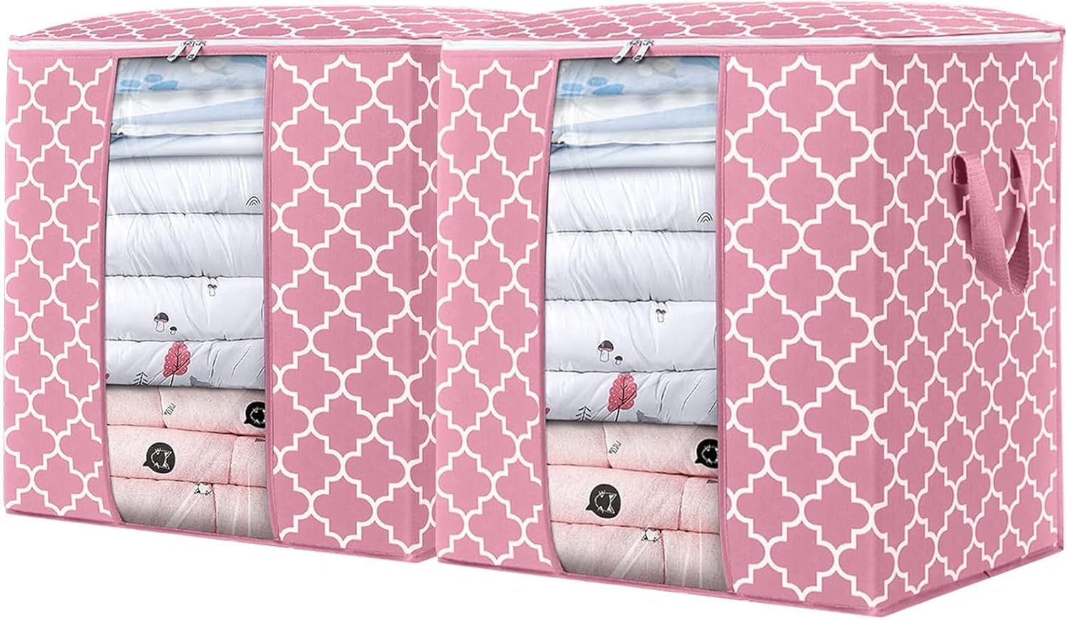 WISELIFE Storage Bags 2 Pack/100L Large Blanket Clothes Organization and Storage Containers for Comforters,Bedding, Foldable Organizer with Reinforced Handle, Clear Window, Sturdy Zippers,Pink