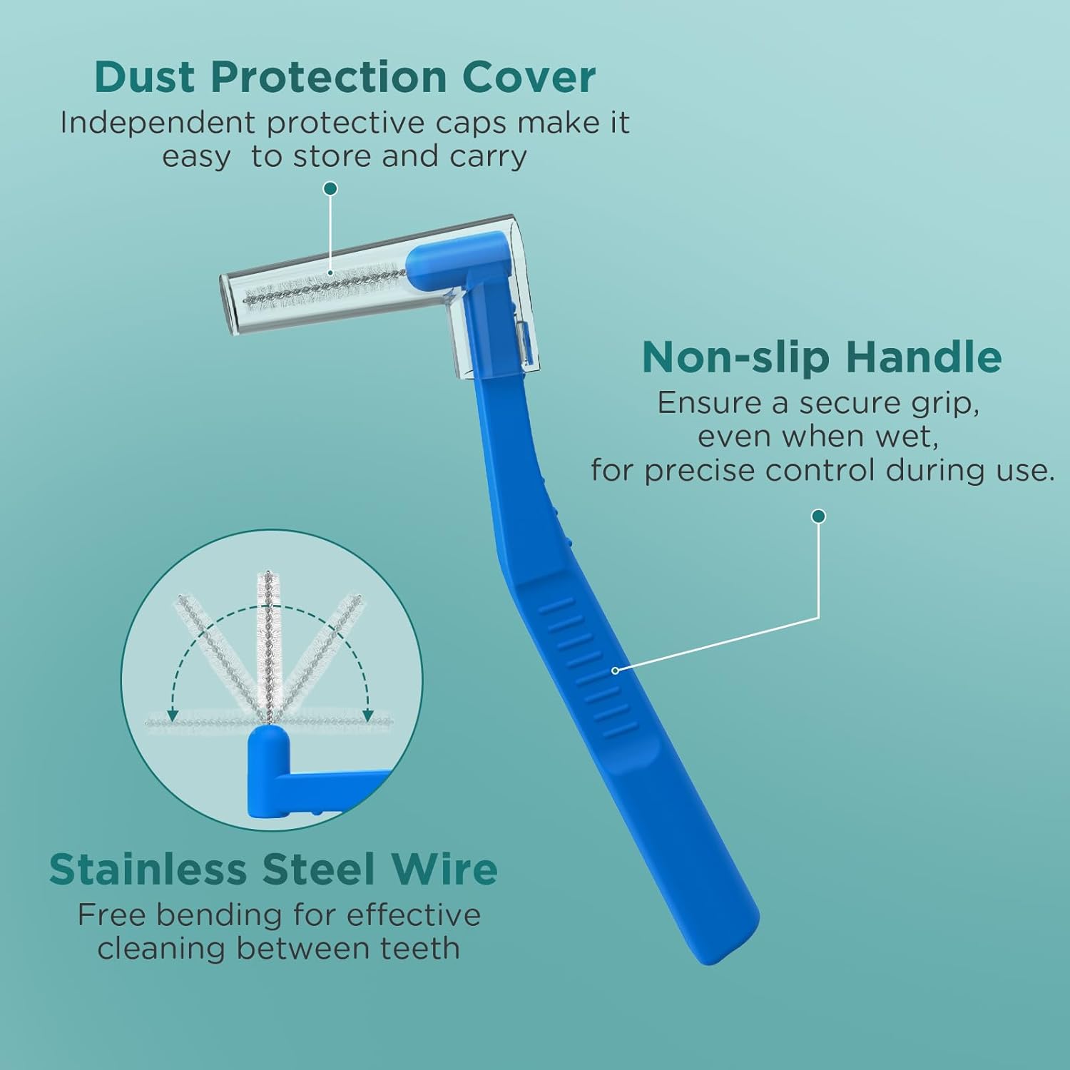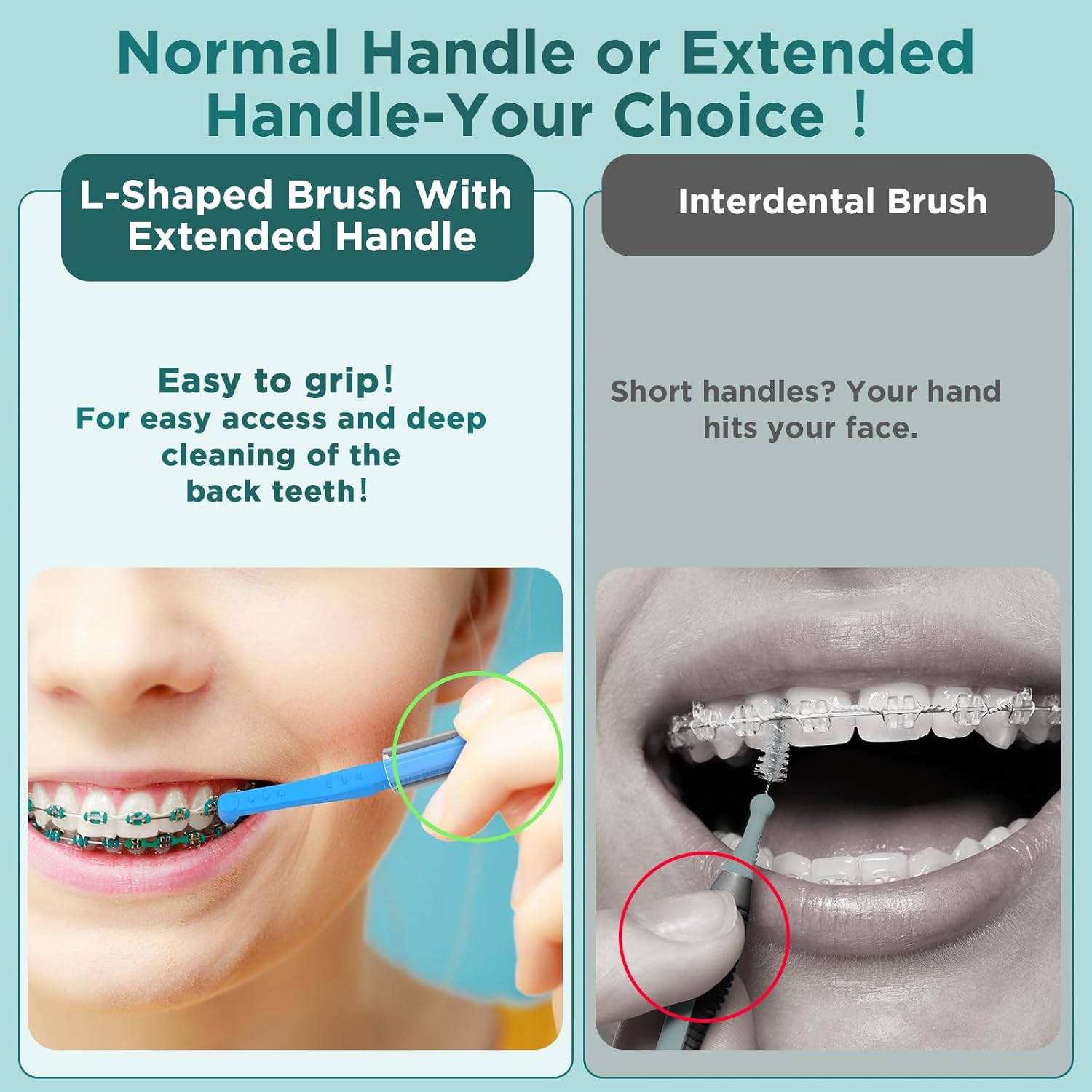 - ANGLE INTERDENTAL BRUSH WITH EXTENDED HANDLE: L-Shaped brush with extended handle facilitates deep cleaning teeth. A non-slip handle and angled neck make it easy to maneuver to the back of the mouth while proxy brush cleans around braces, bridges, implants. Normal handle or extended handle-your choice οΌ
