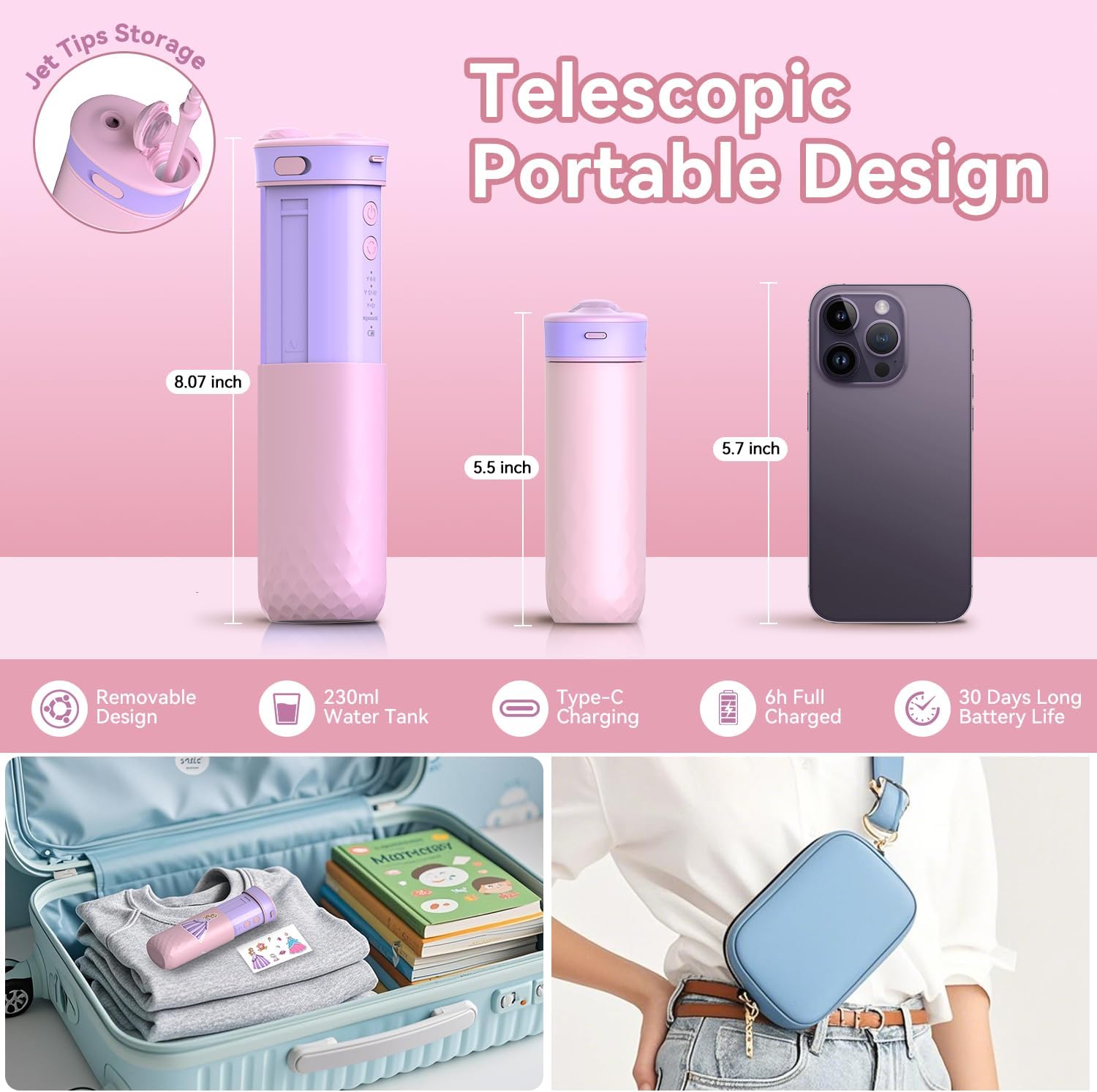 - [LIGHTWEIGHT AND PORTABLE] The oral irrigator features telescopic technology that allows the device to collapse into a mini size for easy storage. Its compact, cordless design and only 0.47 lbs weight makes it perfect for use at home or while traveling. The built-in storage space on the top of this handheld dental irrigator can keep the nozzles during travel, reduce loss and damage, and keep them clean.