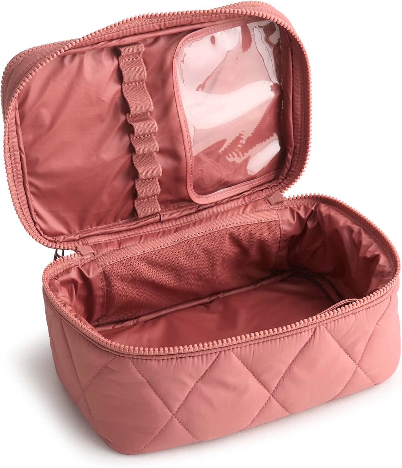 - DETAILS - Interior features two zip pockets, two slip pockets, and eight elastic makeup brush loops with a wipeable TPU cover