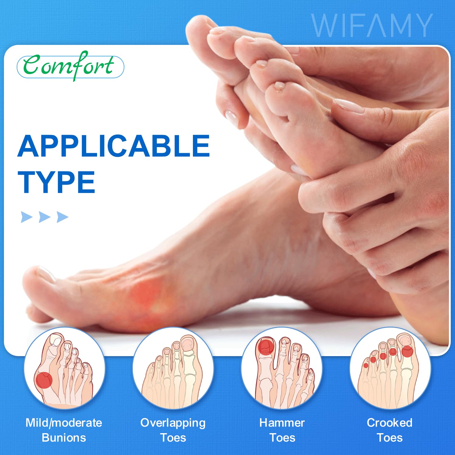- Unisex One Size Fits All Bunion Splint: Wifamy bunion straightener is designed to fit all foot sizes. It comes with velcro straps that are designed to secure the bunion fixer around the toe and the foot. The straps can be adjusted to fit all foot sizes and apply optimal pressure for practically pain free correction of bunions.