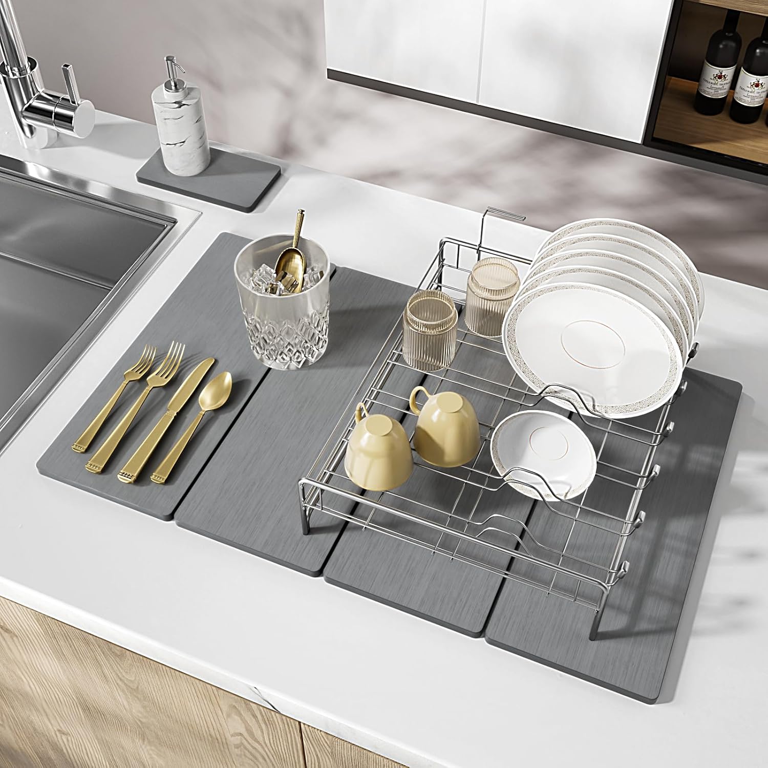 - 【Foldable & Space-Saving Design】Engineered for modern living, this large stone dish drying mat folds compactly, saving up to 60% storage space. Perfect for cozy kitchens or minimalist setups! Customize it effortlessly—trim to any size to fit your sink, countertop, or drying rack precisely.